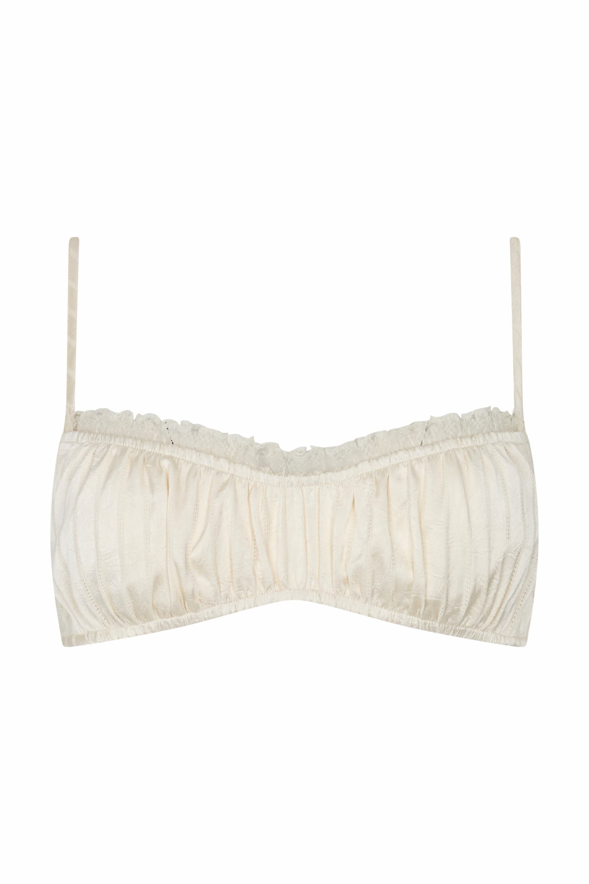 The Aries Bralette features a delicate frill along the sweetheart neckline and a softly ruched design for a feminine finish. Crafted from a silky-soft satin, it is designed with an elasticated back and adjustable straps for a comfortable, secure fit. Wear it alone or layered under the Ivy Shirt — perfect for lounging or dressing up.