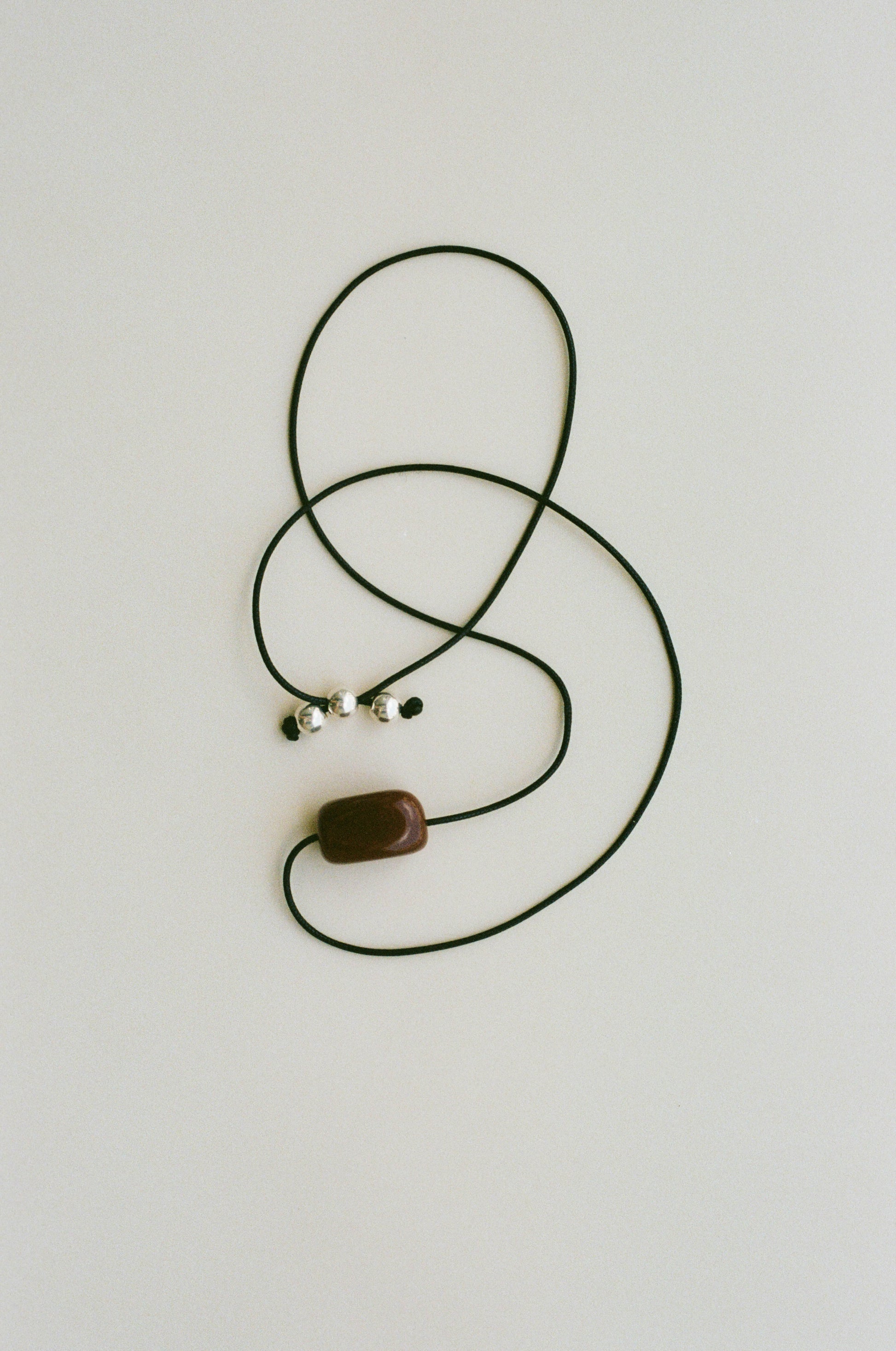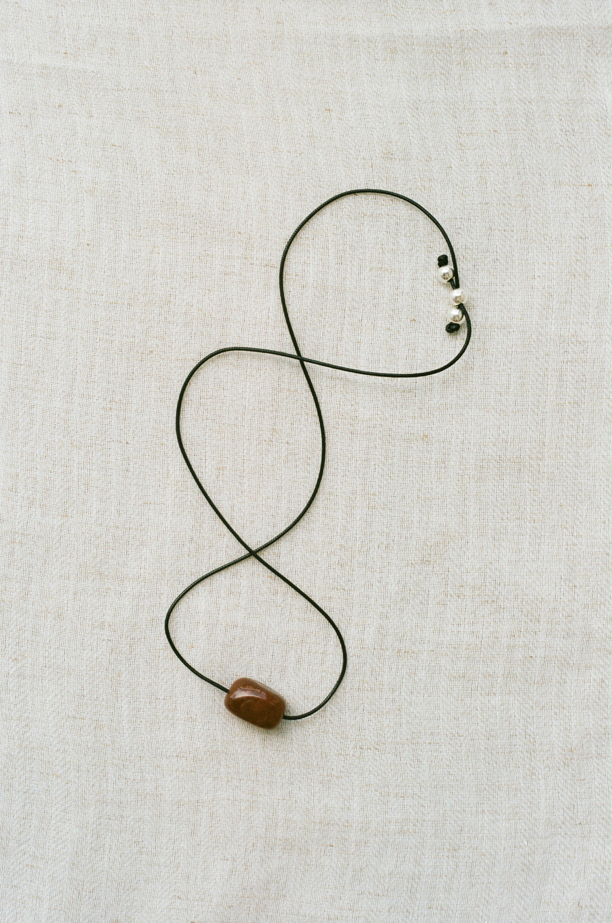 Inspired by the simplicity of natural forms, this pendant necklace features a single carnelian gemstone on an adjustable black cord, accented with delicate sterling silver beads. Wear it as a choker or worn longer, providing versatility to compliment any outfit.