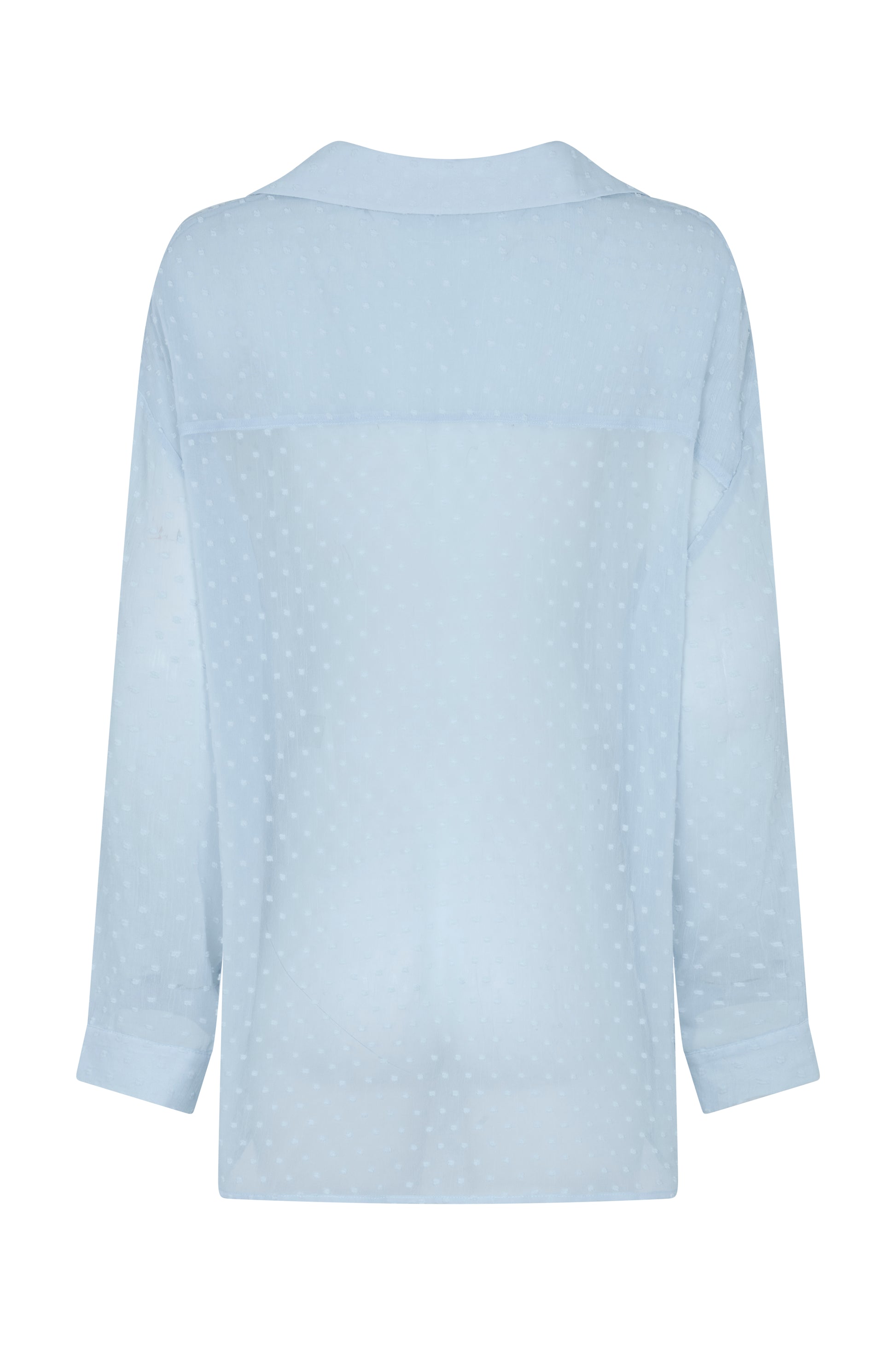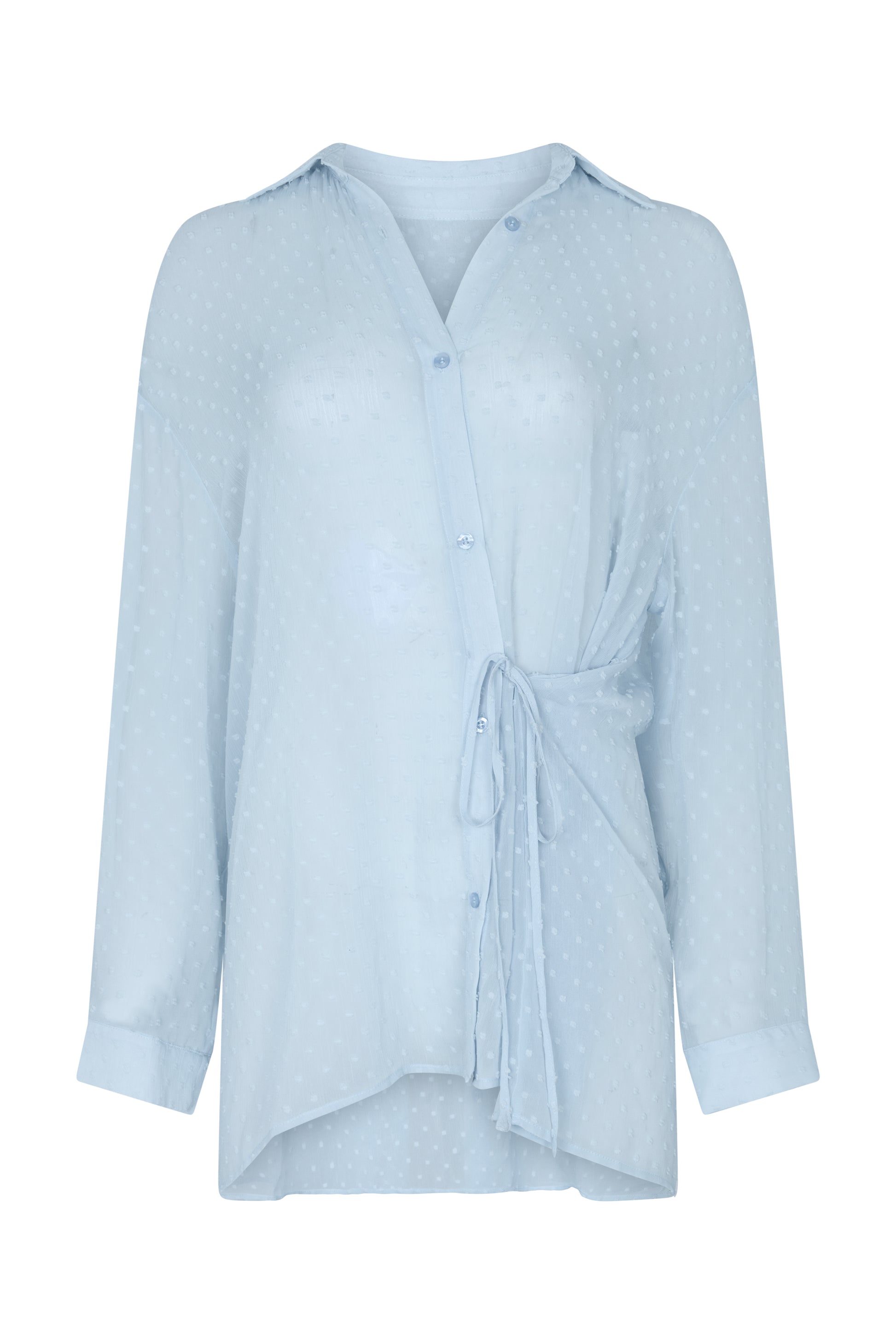 Sheer blue dot fabrication Oversized design Adjustable side tie Classic collared neckline Centre front button placket Long sleeves with cuff detailing