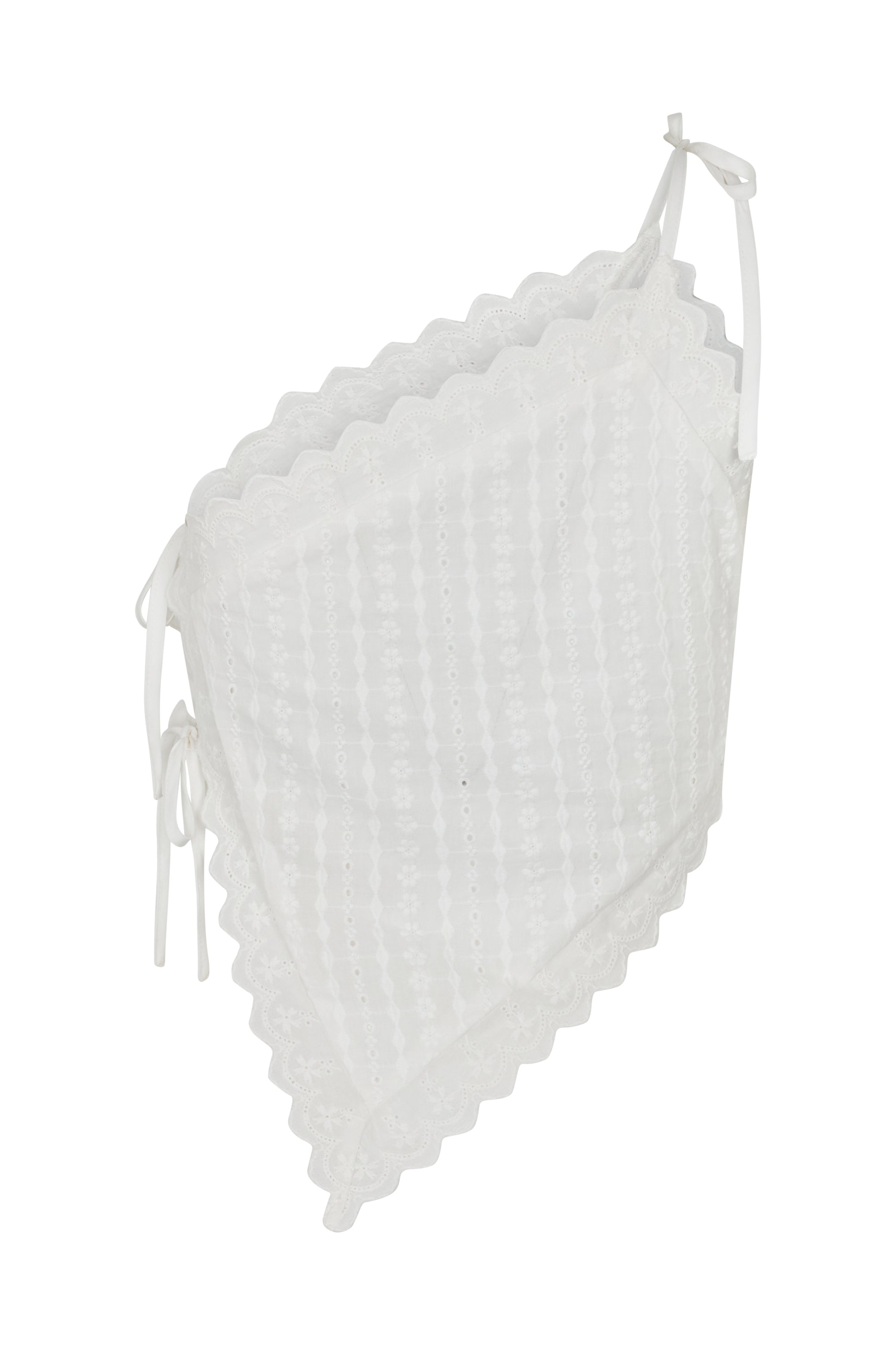 Broderie anglaise fabrication Doily-inspired detailing Scalloped edging Adjustable shoulder ties Underarm tie detail Fully lined for coverage