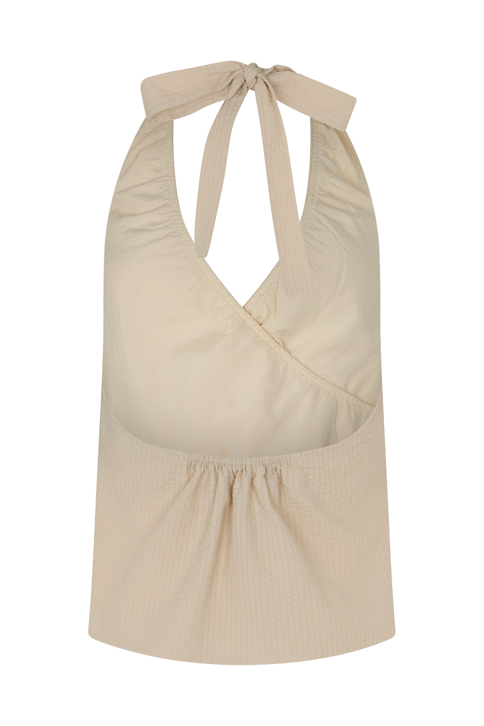 Crinkle stripe fabrication Halter tie Elastic back and neck Wrap style V neckline Internal tie Adjustable fit