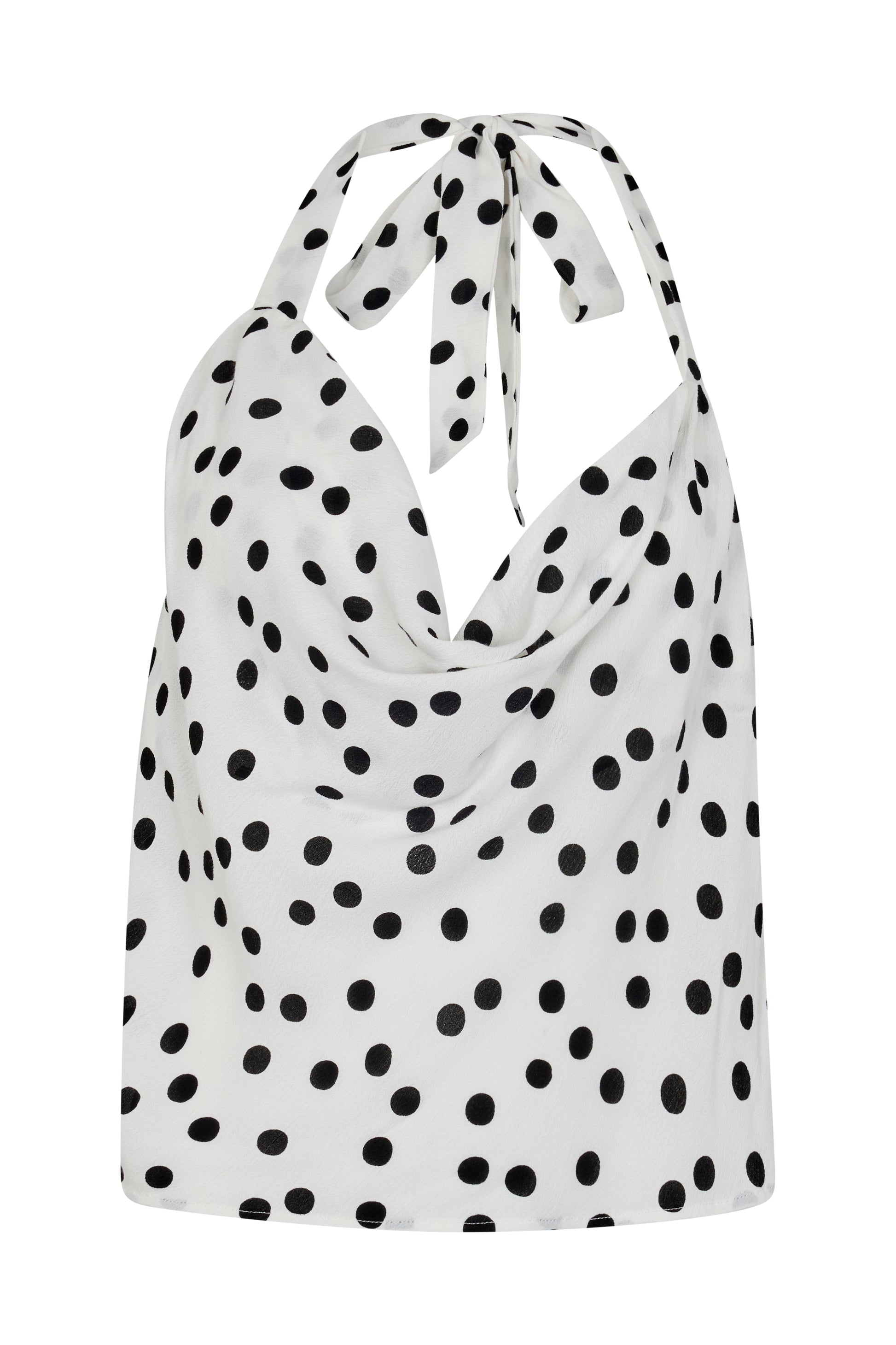 The Serene Top is an elevated basic in a classic white and black polka dot print, designed with an asymmetrical cowl front for a modern twist. Featuring a halter neckline with adjustable wide straps, low back, and double-lined bust. Versatile and polished, it pairs uniquely with the Serene Pant for a coordinated look or with your favourite denim for effortless everyday styling.