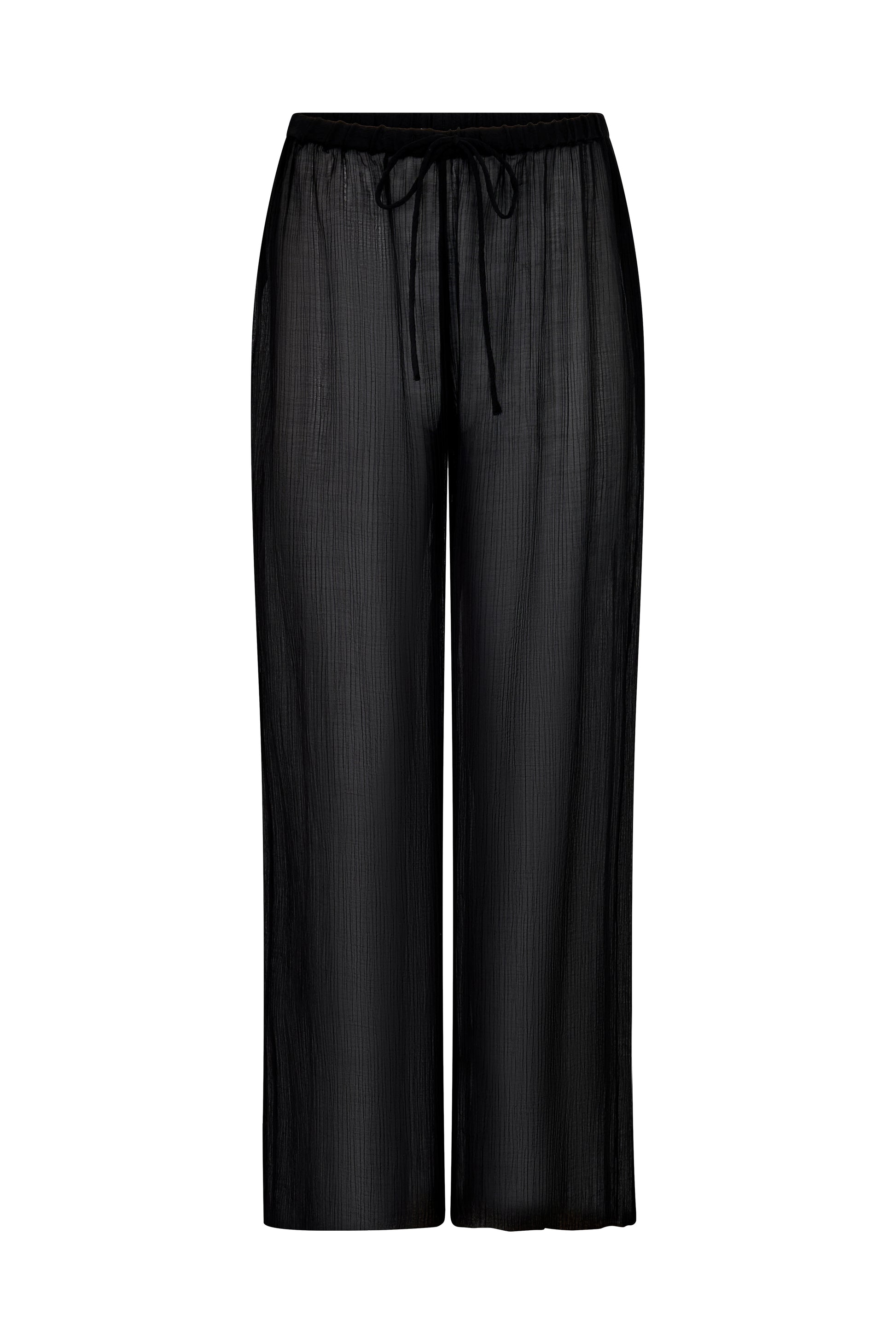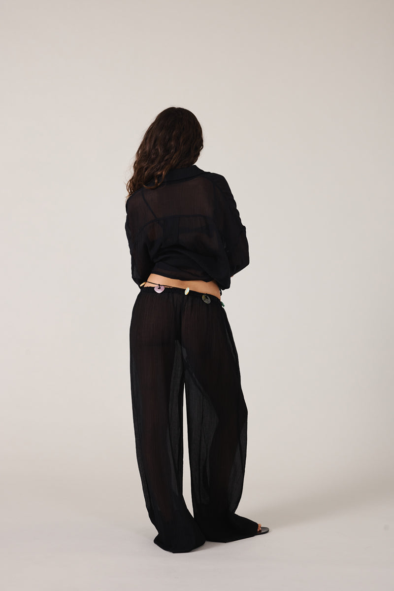 The Sienna Pant is crafted from a sheer gauze fabrication for a lightweight, relaxed feel. Designed with an elasticated waistband and a thin drawstring for a comfortable fit, it features wide cuff detailing at the ankles for a subtle, elevated touch. Perfectly paired with the Sienna Shirt or over your favourite swim set.