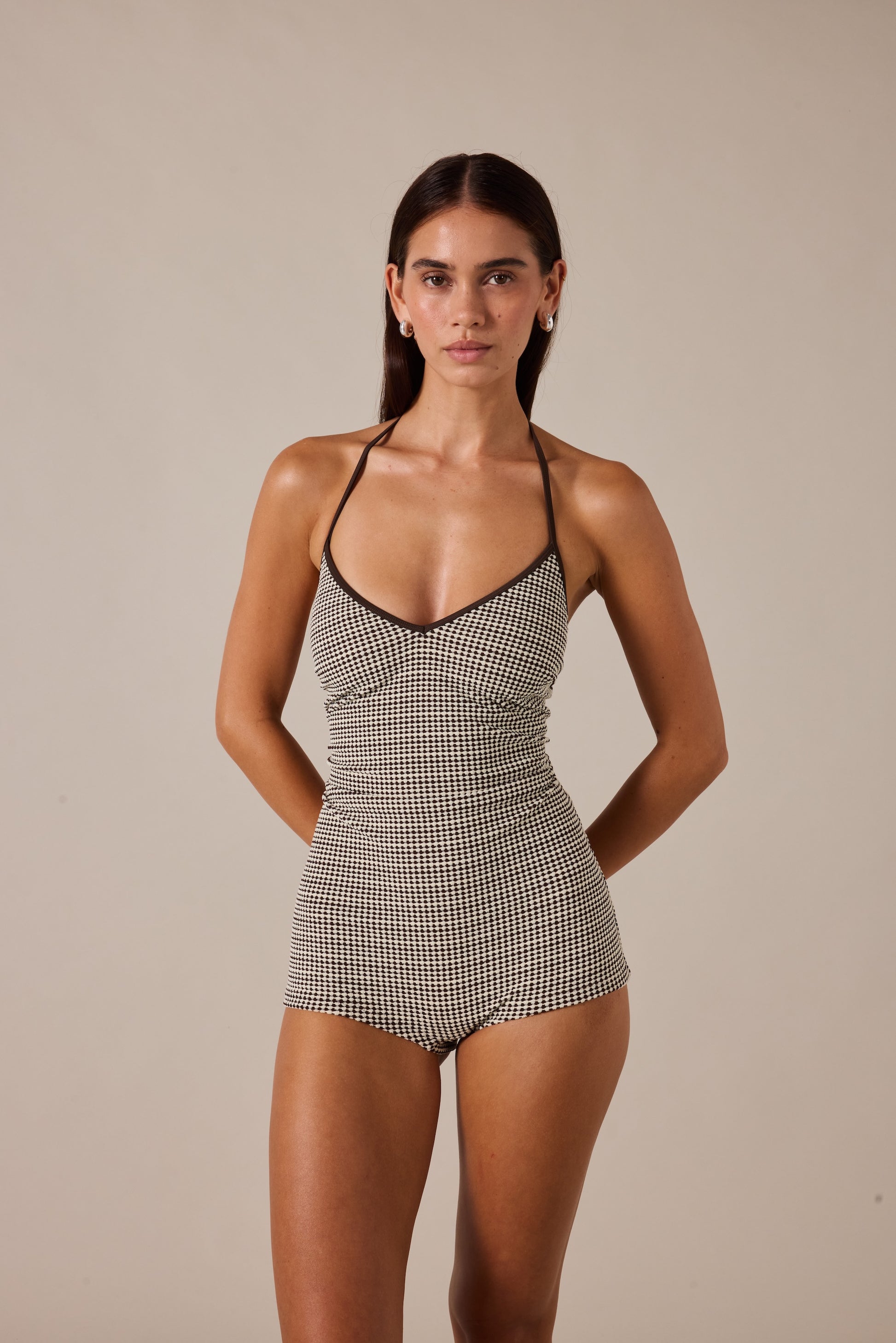 V-neckline Halter neck straps Low back silhouette Mini Short design Contrast brown detailing Hardware-free Lined