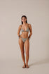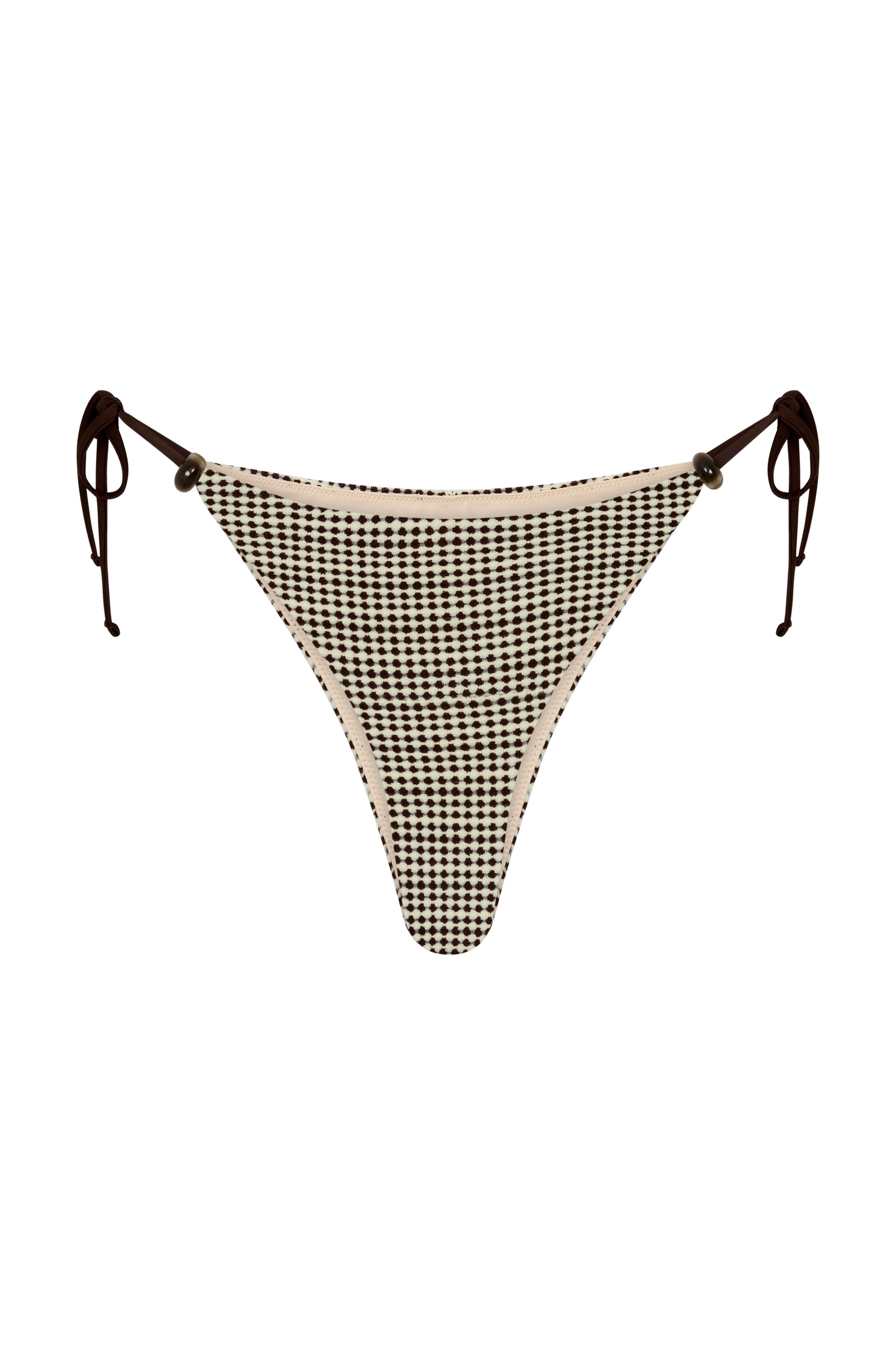 The Valeta Tie Bottom features a refined small brown dot print in warm Cognac tones. Designed with adjustable side ties, it’s finished with delicate beaded detailing for a subtle elevated touch. It pairs seamlessly with the Valeta Triangle Top to complete your set.