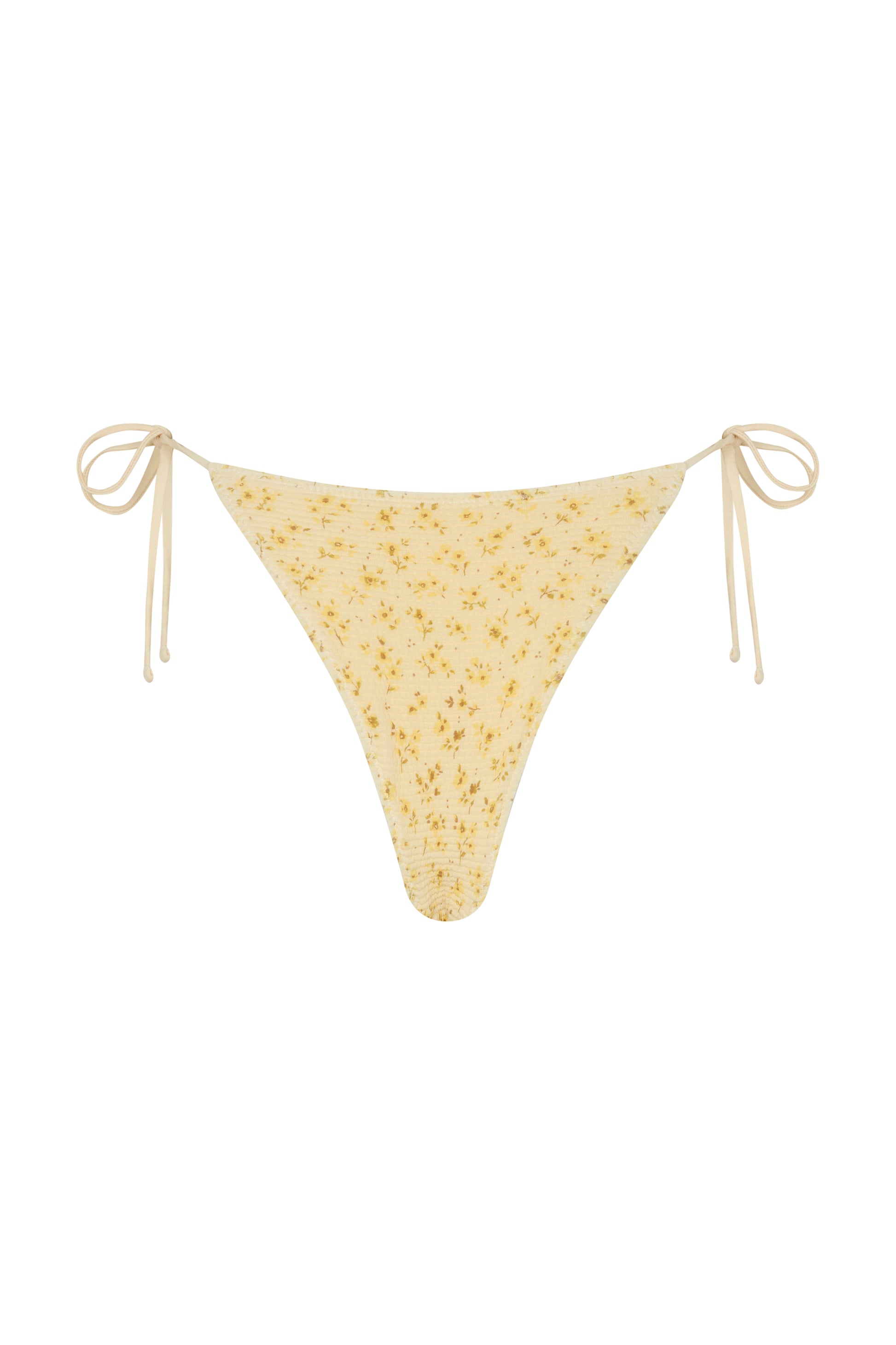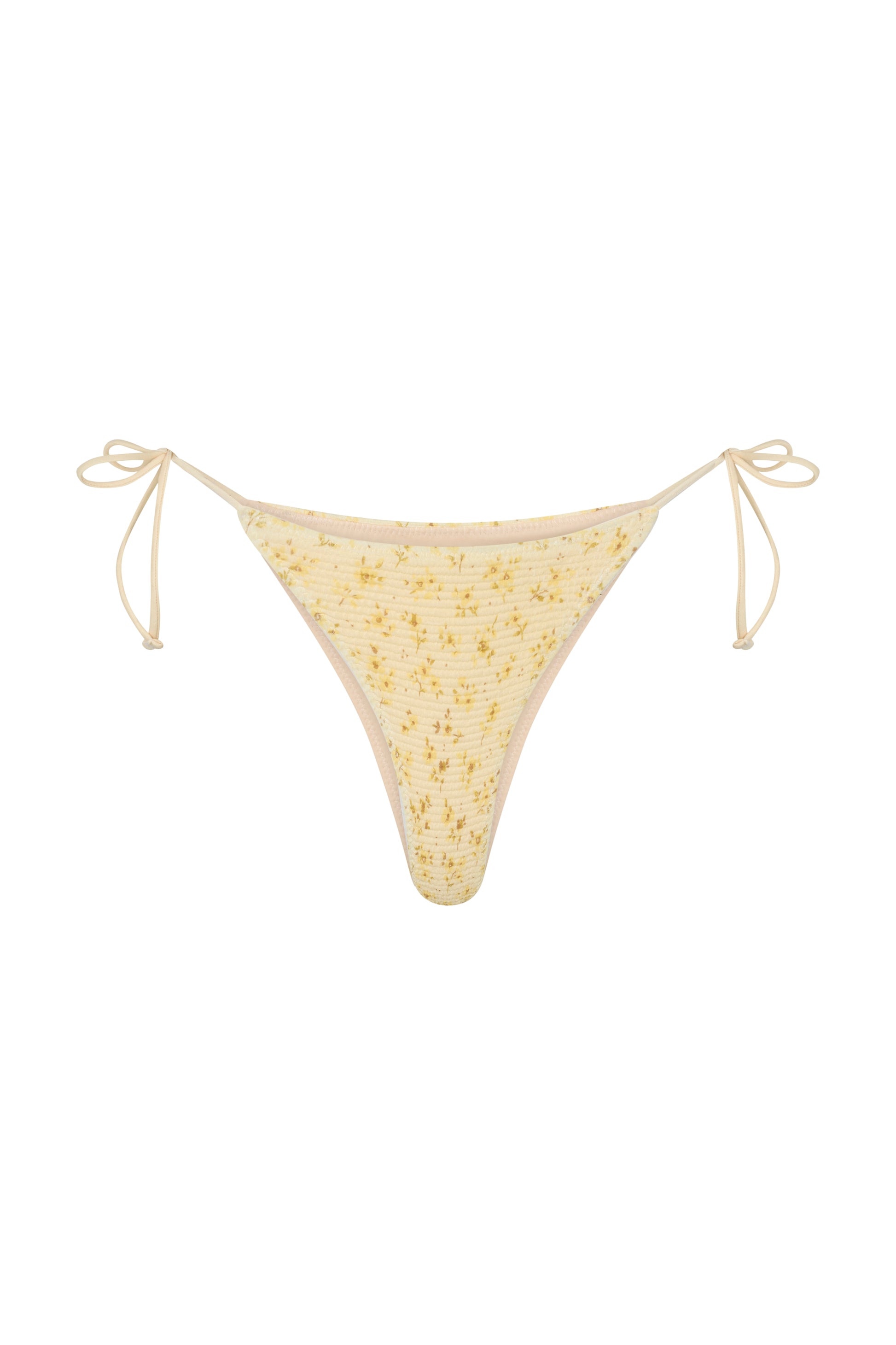 The Vera Bottom is crafted from soft, stretchy fabric in a delicate floral print. Designed with a low-rise front, adjustable tie sides, and minimal coverage, it’s fully lined for comfort. Pair with the Vera Top or Magnolia Bra Cup in Marigold to complete your set.