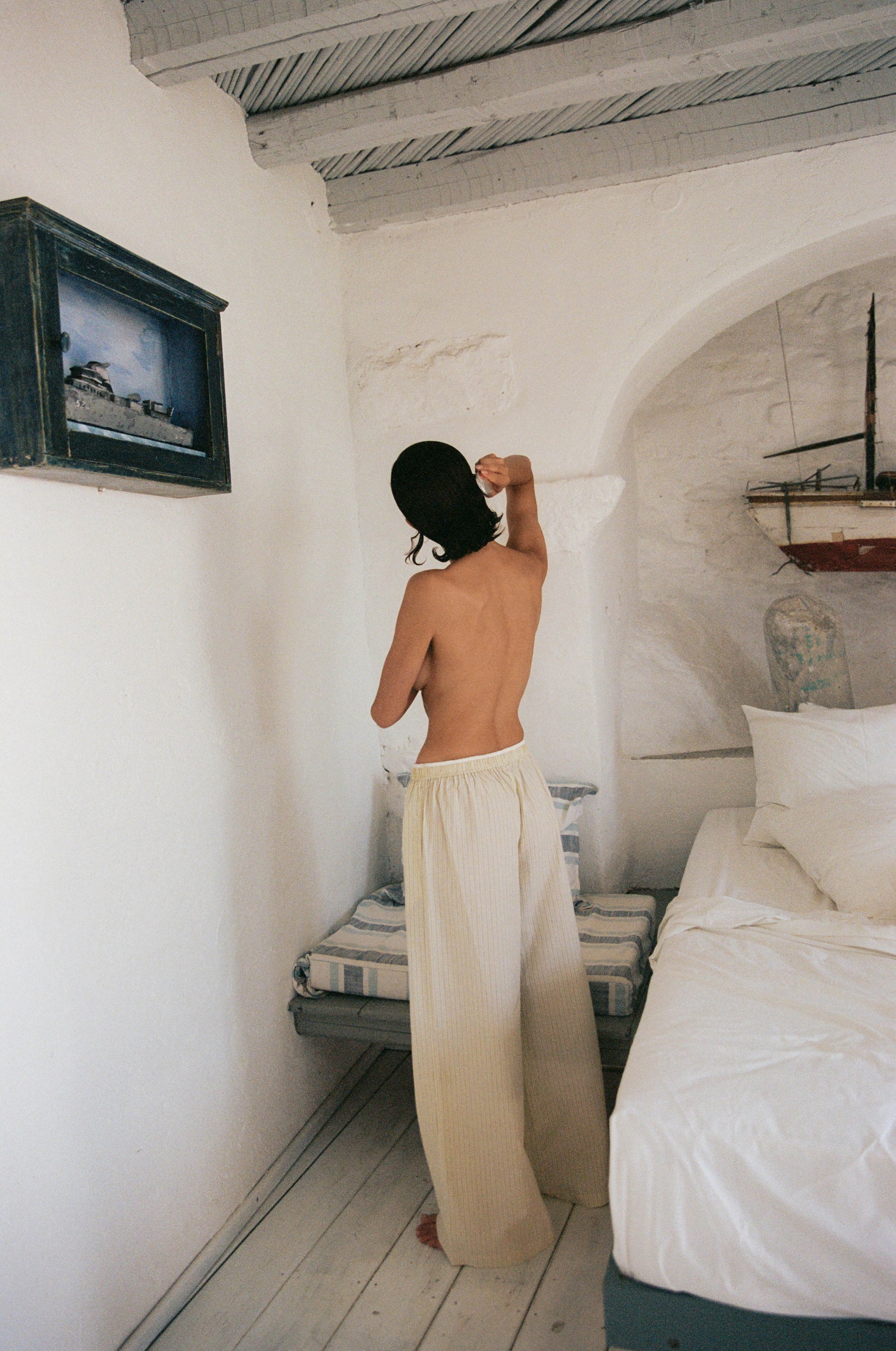 The Yoli Pant is crafted in a soft cotton blend with a citrus pinstripe. Featuring contrast waistband detailing, a subtle two-button front, mock fly, and side pockets, the relaxed, boxy fit brings ease to everyday dressing. Pair back with the Yoli Shirt for a coordinated look.